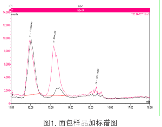 从市场和超市中选取两种面包产品,上述离子色谱条件分析,所得回收率结果分别为98%和106%。样品加标色谱图如图2所示。表1为面包样品的测定结果。由这些数据可以看出,在所检测的两种面包中均含有不同含量的溴酸盐。
